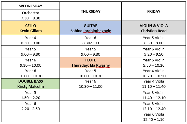 We welcome Mr Christian Read from IMSS who will be the Violin & Viola teacher for this term, commencing Friday. Ms Kirsty Malcolm will continue to take Double Bass lessons in Mrs Person’s absence. Due to the reschedule, some instrumental lesson times have been changed to the following.