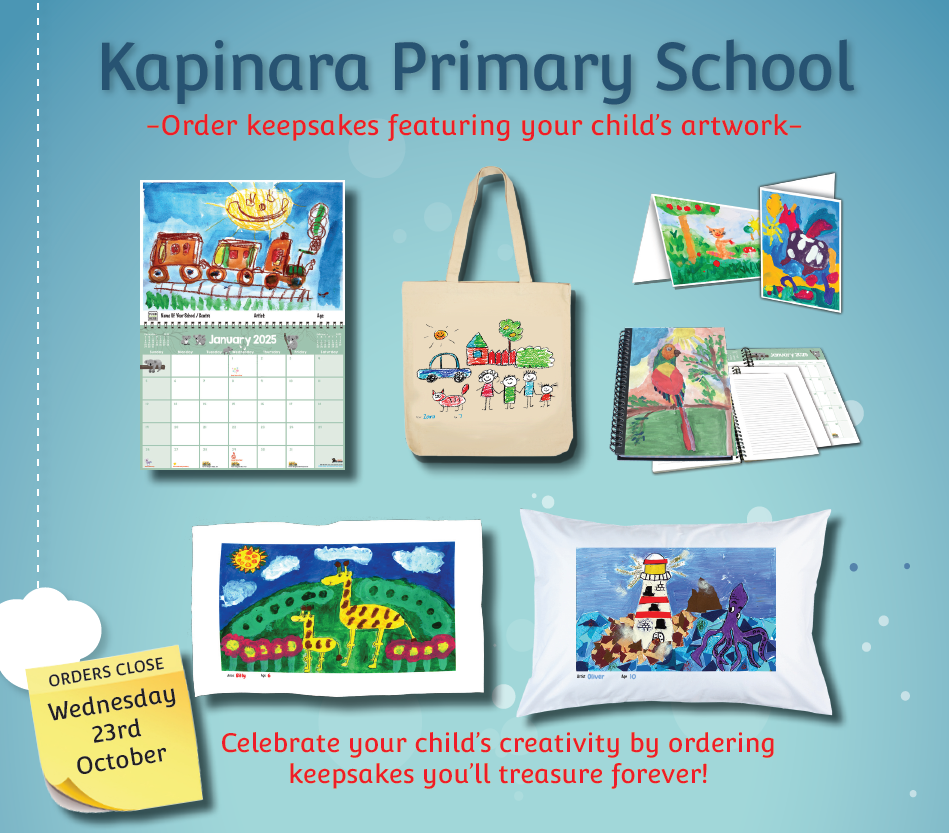 There are only a couple of days left to order precious keepsakes featuring your child’s beautiful Christmas themed artwork. Greeting cards, calendars, diaries, notebooks, sketchbooks, pillow cases, tea towels or tote bags are available to order via the link. Samples of the products are in the front office. Orders close Wednesday October 23. All proceeds go to our P&C.