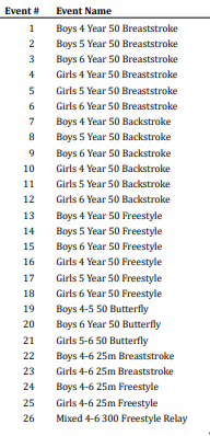 We do not have times for individual events, however please find below the program (each event may have more than one heat). We anticipate Event 1 will begin at 9.15am.