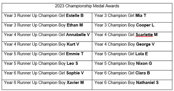 The points from all individual events (over both carnival days) contributed to overall championship points and below are the recipients of the championship medals. Congratulation to these students on their outstanding achievement.