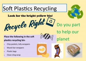 From Monday 8th November we will be trialling for 2 weeks collecting soft plastics at school from your lunches. Look out for the bright yellow bin and put your chip packets, lolly wrappers, muesli bar wrappers, plastic bags and clean cling wrap into it. We will take the plastic collected to a local collection point through a scheme run by the REDcycle program.