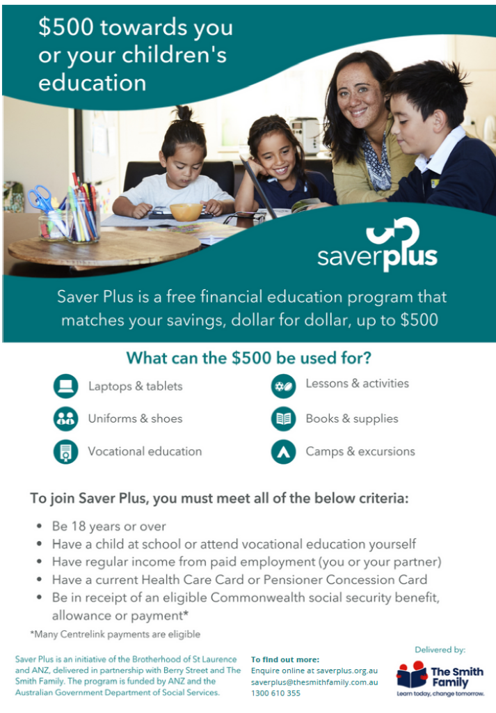Saver Plus encourages eligible parents to save $50 a month (for 10 months). Saving is then matched – a free $500 for education costs, making $1,000 available for the school camp.