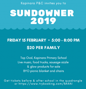 This Friday is the Annual Kapinara Sundowner. Tickets are $20 per family and can be purchased by placing $$ in an envelope with your name in the draw in the school office, from the Quad Monday and Friday Mornings and Wednesday Arvo, or through the Try booking link https://www.trybooking.com/BARAI
